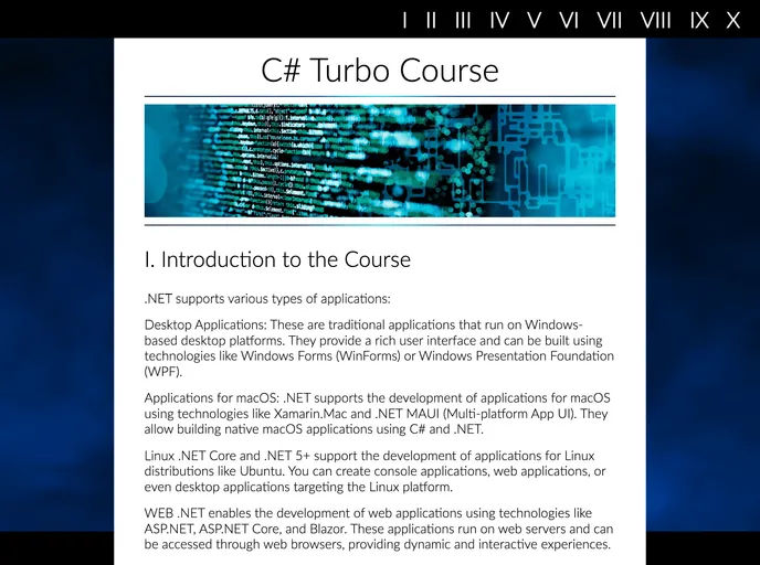 The C# Turbo Course is a comprehensive programming course designed to introduce beginners and those with some programming experience to the fundamentals of C# programming. With the goal of helping users develop a solid foundation in C# and create their own applications, this course offers practical examples and exercises for each topic covered. By the end of the course, users will have a solid understanding of C# and will be ready to tackle more advanced topics.