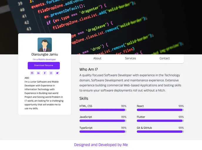 A Simple User Interface Resume design for developer and it can serve as a template for a developer that's inspire in creating portfolio and resume
