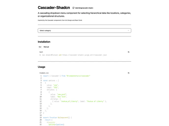 Cascader Shadcn is an intuitive cascading dropdown menu component designed to streamline the selection process of hierarchical data such as locations, categories, or organizational structures. It enhances user experience by providing a structured approach to data selection, allowing users to navigate through options effortlessly.