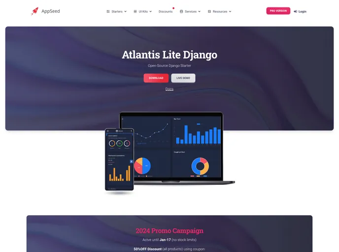 Django Dashboard Atlantis is an open-source admin panel coded in the Django framework. It is built on top of the Atlantis Dashboard design and offers a range of features including SQLite, Django native ORM, modular design, session-based authentication, forms validation, and a UI kit provided by ThemeKita. There are also PRO versions available that include premium UI kits, lifetime updates, and 24/7 live support via Discord.