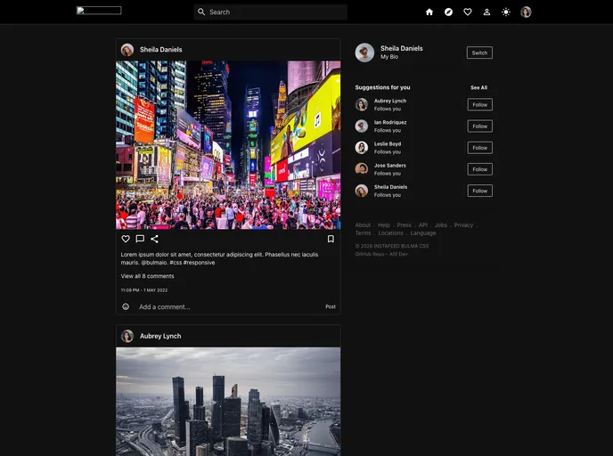 Instagram feed template similar looks using html, js, scss or less and bulma css framework
