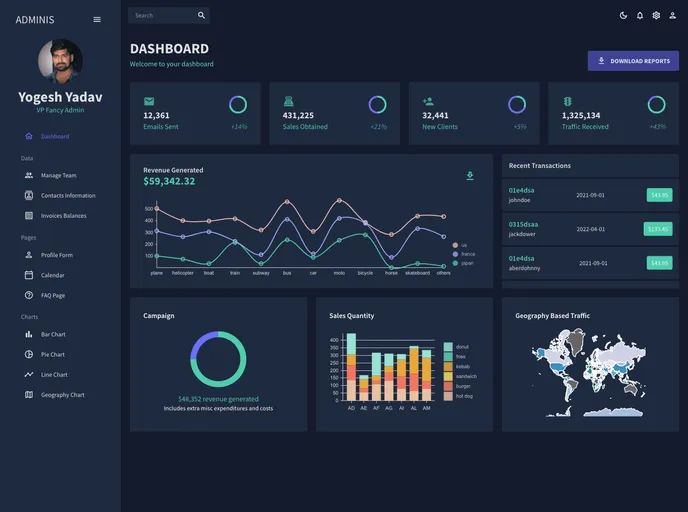 The React Dashboard is a feature-rich admin dashboard app built using React and Material UI. With its data grid, light and dark mode options, and user-friendly interface, it offers a comprehensive solution for managing and visualizing data in an admin environment.
