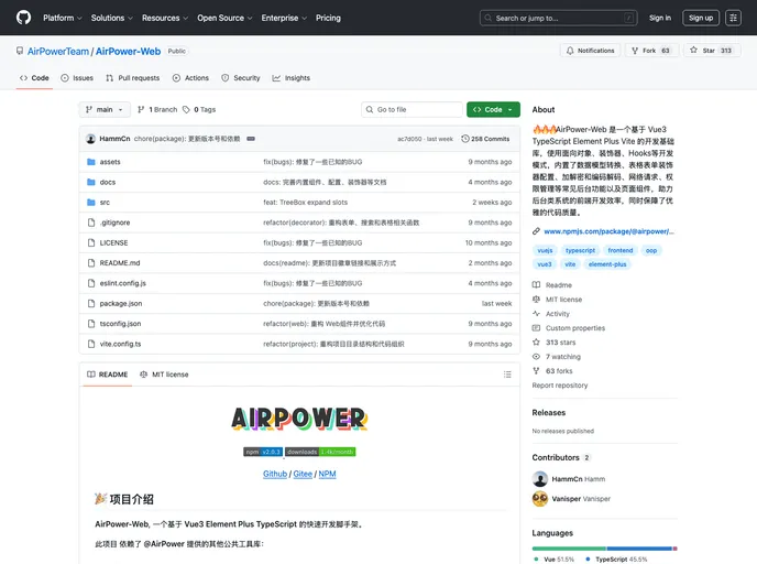 AirPower4T 是一个基于 Vue3 TypeScript Element Plus Vite 的开发基础库,使用面向对象、装饰器、Hooks等开发模式,内置了数据模型转换、表格表单装饰器配置、加解密和编码解码、网络请求、权限管理等常见后台功能以及页面组件,助力后台类系统的前端开发效率,同时保障了优雅的代码质量。