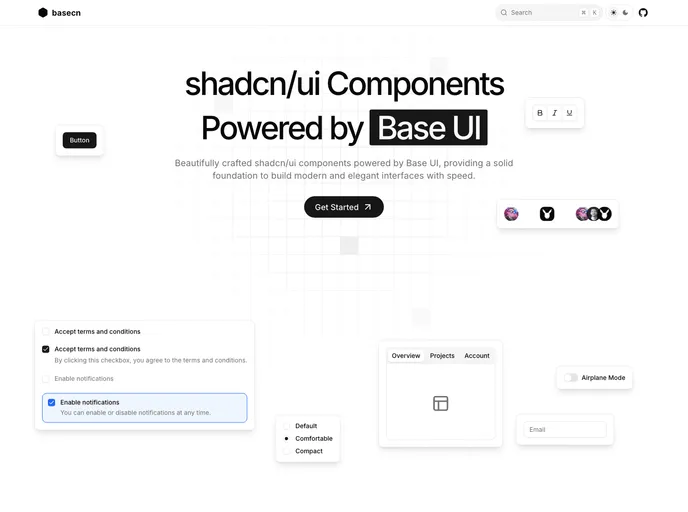 - **Comprehensive Component Library**: Basecn offers a wide range of components, from buttons and forms to modal dialogs, catering to various interface needs.