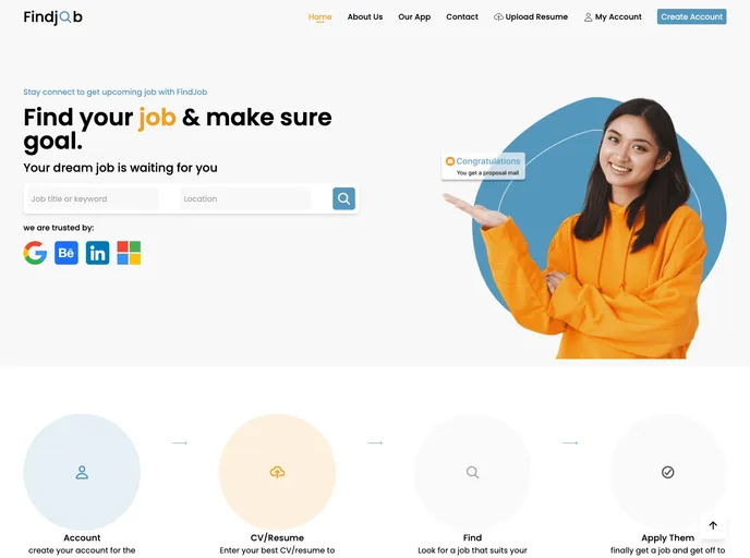 Findjob landing page created with html css javascript and tailwindcss framework. This page is intended to make job searching easier
