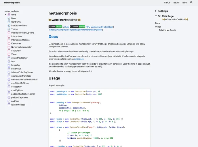 Metamorphosis is a CSS variable management library that helps create and organize variables into easily configurable themes. It can be used as a standalone library or as a complement to other CSS libraries such as Tailwind. The library allows for easy management of variables from the JavaScript side, enabling consistent user theming in applications. Additionally, Metamorphosis supports strongly typed variables with TypeScript.