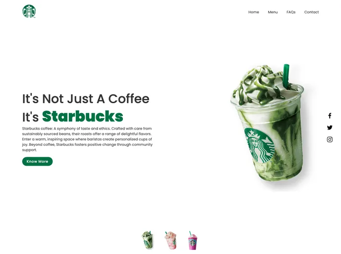The Starbucks Landing Page is a project that showcases the Starbucks brand and offers users an interactive and visually appealing experience. It is built using HTML, CSS, and JavaScript and features a responsive design, interactive elements, eye-catching visuals, a menu display, and social media integration.