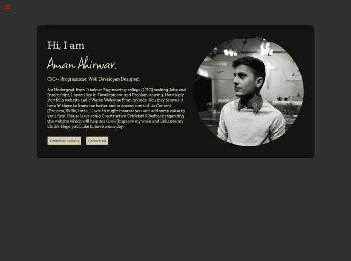 This Website gives you the complete description of myself, the Skills Acquired by me, Projects built Till date, Fully functional Contact me page and many more. Made using Pure HTML (for Structure), CSS (for Styling) and JS (for Behavior). Which might add Value to your Firm.