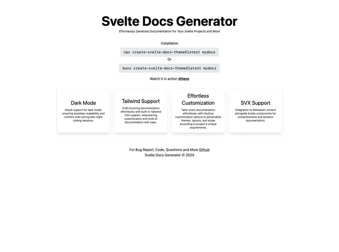 Create-Svelte-Docs-Theme is a versatile and user-friendly tool designed to streamline the documentation process for Svelte projects. With its intuitive interface and robust features, this theme generator enables developers to effortlessly craft professional-grade documentation tailored to their p...