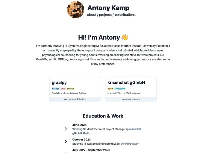 The antonykamp.de website is built using a minimal Next.js template written in TypeScript. The template includes features such as Sass integration and FontAwesome icons. Users can clone the repository, install dependencies, and run the server to create their own website. The dataset for the website can be expanded by editing and adding entries to the existing datasets. The website can be easily deployed using the Vercel Platform.