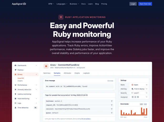 Appsignal Ruby is a robust performance monitoring tool designed specifically for Ruby applications. With its extensive features, it provides developers and teams with the insights they need to optimize their applications, detect errors, and boost overall performance. By integrating seamlessly into Ruby projects, Appsignal Ruby helps users maintain high levels of application uptime and user satisfaction.