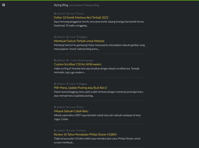 Aping Blog is a personal blog created using Jekyll with the 'Ockham' theme by Song-Zi Vong. The blog has been redesigned to have a minimalistic design and a focus on content.