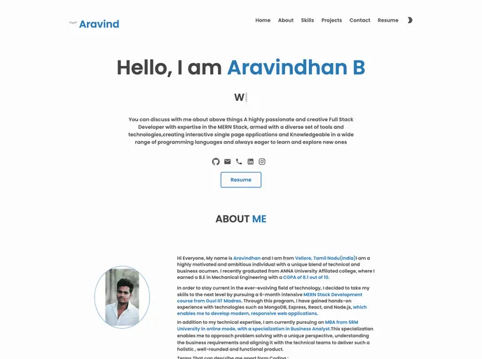 The portfolio by Aravindhan is a website that showcases his work and skills in a visually appealing and easily navigable manner. The website has been designed with a user-friendly interface, allowing visitors to explore his projects, experience, and contact details conveniently.