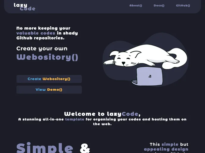 Welcome to lazyCode, a stunning all-in-one template for organising and keep track of your codes and hosting them on the web.
