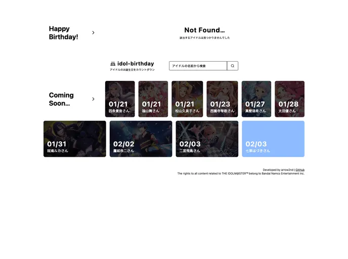 idol-birthday is a website that counts down the birthdays of idols from the game series "The Idolm@ster" (アイマス). Powered by im@sparqlVercelidol-birthday, this site allows users to see the remaining seconds until an idol or staff member's birthday and share it on various social media platforms. The site uses a custom-defined Cloudinary Named Transformation to generate OGP images, although the specific details of the definition are not included in the repository.