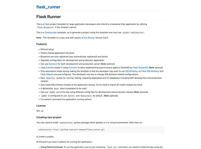 Flask Runner is a Flask project template designed for developers working on large applications who want to modularize their code using Flask Blueprints. It is a Cookiecutter template, which means it can be used to generate projects using Python Cookiecutter. This template is based on Eve Runner Version-5.0.2.