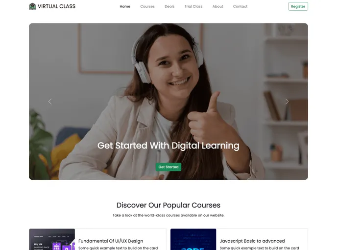 Virtual Class is a responsive landing page created using Bootstrap. It provides an interface similar to an Ed Tech Platform to provide online courses to students.