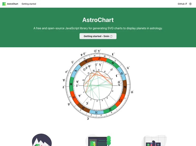AstroChart is a free and open-source TypeScript library designed for generating SVG charts that display planets in astrology. This library does not calculate the positions of planets in the Universe. It is a pure TypeScript implementation without any dependencies, providing SVG graphics with tested code. The documentation for AstroChart is a work in progress.