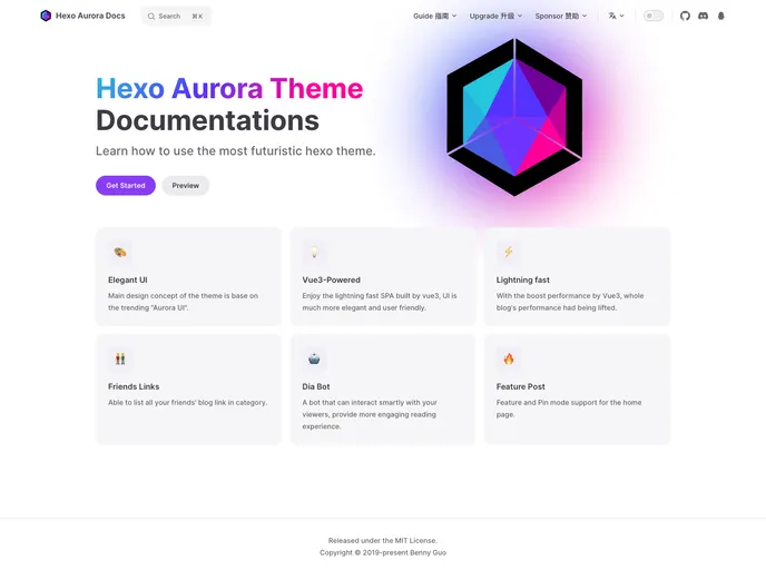 The Hexo Theme Aurora is a sleek and modern theme designed for the Hexo blogging platform, specifically tailored to enhance the user experience for Obsidianext documentation. With its clean aesthetics and intuitive functionality, this theme makes it easy for users to showcase their content beautifully and efficiently. Whether you are a seasoned blogger or just getting started, Aurora offers a fresh approach to presenting your ideas online.