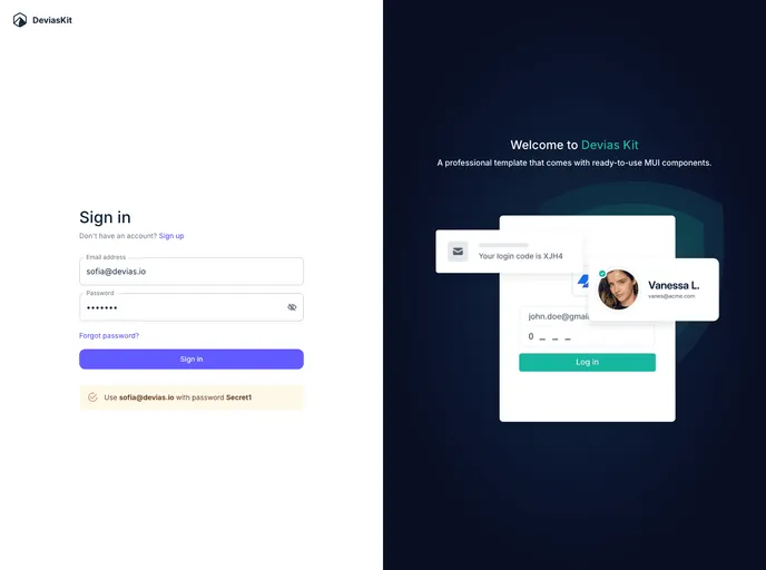 The Material Kit - React is a free React Admin Dashboard built with MUI's components, React, and Next.js. It aims to boost app development processes with its various pages and components. There is also a pro version available with even more pages and components.