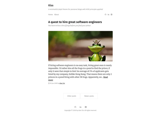 A minimalist Jekyll theme for personal blogs with KISS principle applied. Made with