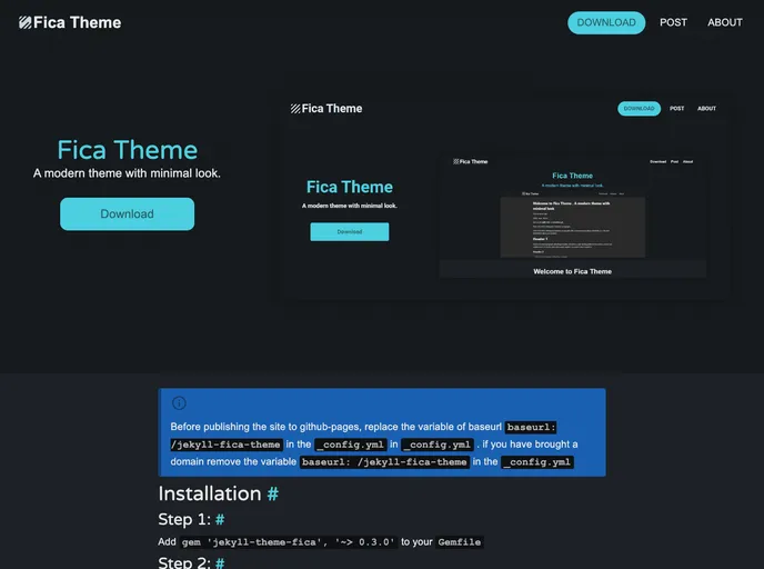 The Fica Theme is a customizable theme for Jekyll, a static site generator. This theme is designed to be visually appealing and user-friendly. It offers a variety of features and customization options, making it suitable for a wide range of websites. The theme is available for preview and download, and it is open source under the MIT License.