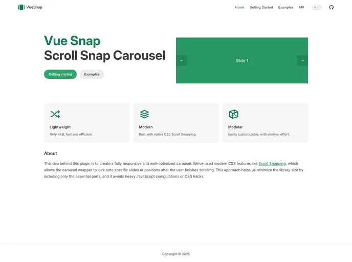 This carousel solution boasts a lightweight footprint while maintaining versatility and ease of use, making it ideal for projects of various sizes. With a focus on performance and style, Vue Snap integrates seamlessly into your Vue 3 applications, providing both functionality and aesthetic appeal.