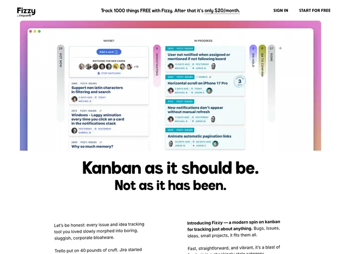 Fizzy offers a fresh approach to project management, embracing the principles of Kanban in a way that feels revitalizing. Designed to help teams streamline their workflows, it facilitates a more intuitive and collaborative work environment. The platform effectively combines visual task management with dynamic features that adapt to modern needs, making it suitable for both small teams and larger organizations.