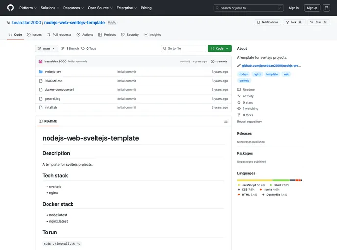 The nodejs-web-sveltejs-template is a template designed for sveltejs projects. With a tech stack comprising sveltejs, nginx, and a Docker stack using the latest versions of Node.js and Nginx, this template offers a convenient starting point for building web applications with Svelte.
