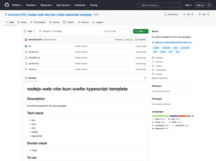 The NodeJS Web Vite Bun Svelte Typescript Template is a ready-to-use template for building web applications using Svelte, TypeScript, Vite, and Bun. Powered by NodeJS and Docker, this template provides a robust tech stack for developing efficient and scalable web applications.