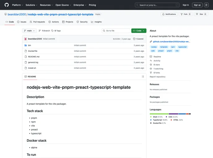 This product analysis is about a preact template for the vite packager. The template is designed to be used with node.js and utilizes pnpm, npm, vite, preact, typescript, and the alpine Docker stack. The installation process involves running specific commands using the provided install.sh script. The template is based on the Vite documentation and credits are given to the Vite documentation for reference.