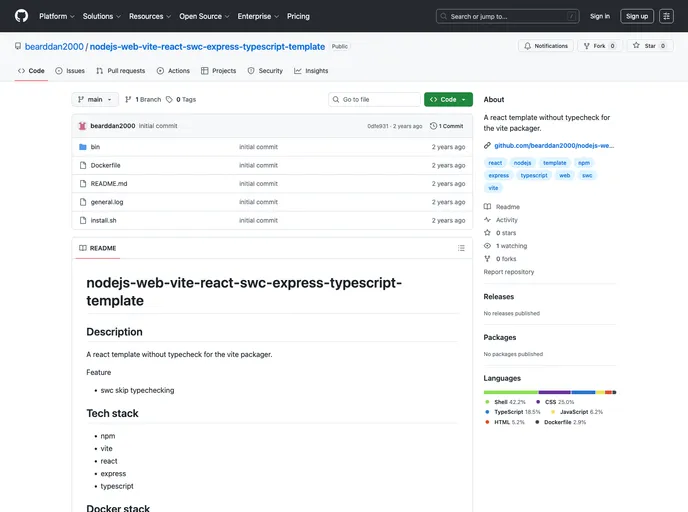 This is a react template for the Vite packager, designed for use with Node.js. It does not include typechecking using the SWC tool. The template features the Vite packager, React, Express, and TypeScript. It can be run using the provided installation script and can also be stopped using the script if needed. The template is available on npm and includes Docker support.