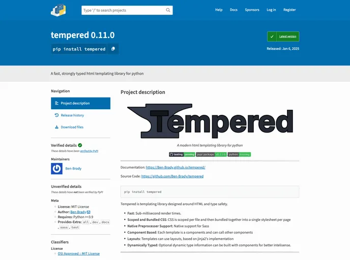 Tempered is a beta tool that allows users to convert HTML templates into native python components. It offers increased performance compared to popular frameworks like Jinja and Django, with the ability to check compiled components using static analyzers. Tempered also provides support for scoped CSS and layouts inheritance.