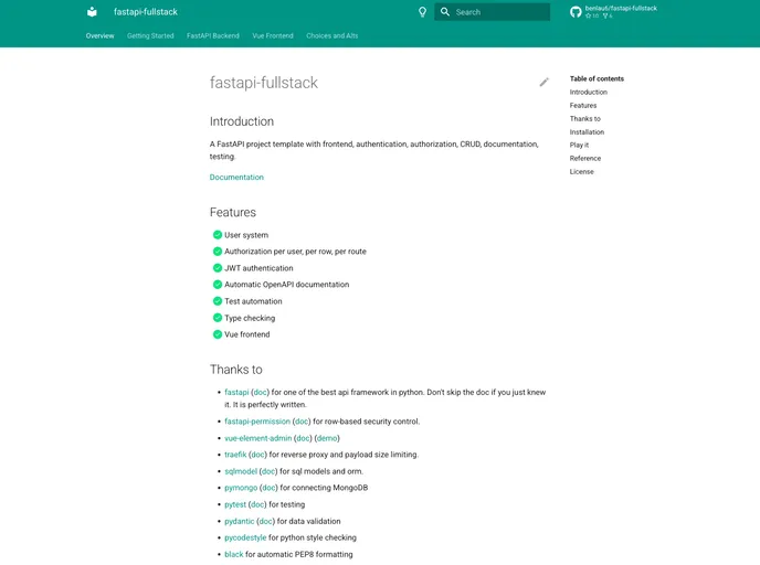 Fastapi Fullstack is an impressive project template that streamlines the development of web applications using the FastAPI framework. With built-in features for front-end development, authentication, and authorization, it provides a robust foundation for building fully functional, scalable applications. The project emphasizes efficient CRUD operations, comprehensive documentation, and has testing capabilities, making it an attractive option for developers looking to get started quickly and effectively.