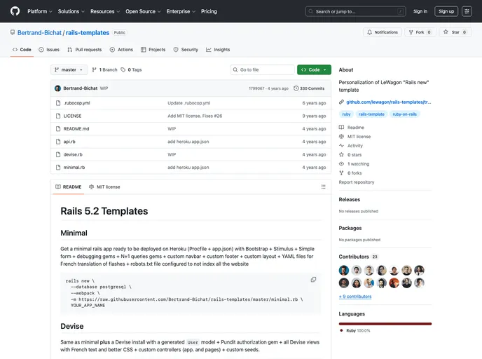 Rails 5.2 is a web application framework that provides useful files for a custom rails new template. It includes components such as a custom navbar, custom footer, HTML files for flashes and layout, YAML files for French translation, Ruby files for Pundit, controllers and seeds, Devise French views, and a JSON file for Heroku setup.