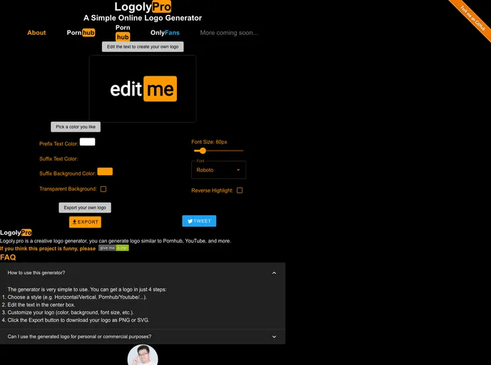 Logoly is an innovative logo generator specifically designed for creating unique and eye-catching logos that resonate with the adult entertainment industry, particularly Pornhub. The tool appeals to content creators, adult brands, and marketers looking for a simple yet effective way to enhance their visual identity. With its user-friendly interface, Logoly allows users to experiment with various designs effortlessly.