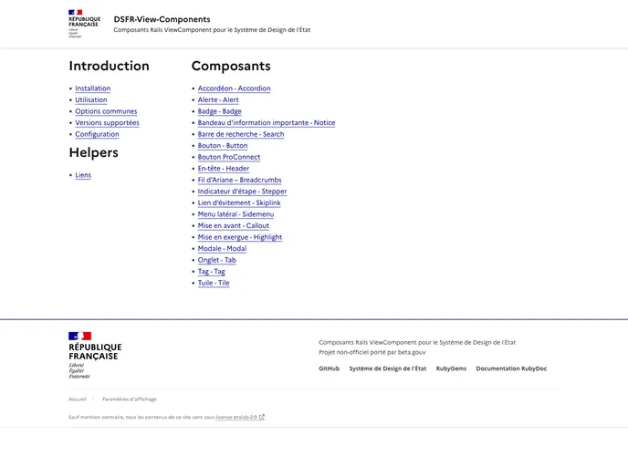 Dsfr View Components is a set of Rails components designed to enhance the user experience in applications adhering to the DSFR (Design System for French Public Services). This library offers a collection of reusable components that streamline the development process, ensuring a consistent look and feel across various applications while promoting best practices in UI design.