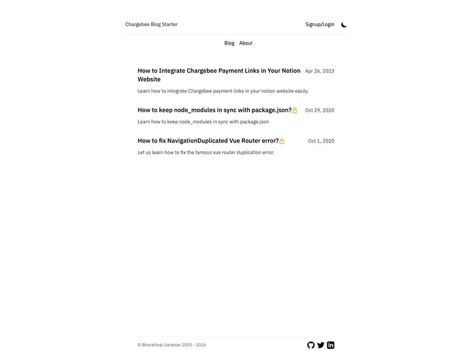 The Chargebee Notion Blog Starter is a Next.js starter site that utilizes Notion as a content management system (CMS) and Chargebee for managing membership subscriptions. The site also stores authentication and user profile information in Supabase, which is a PostgreSQL database. The starter site boasts fast and responsive page renderings, a variety of features such as comments and tag filters, and easy customization options with Tailwind CSS.