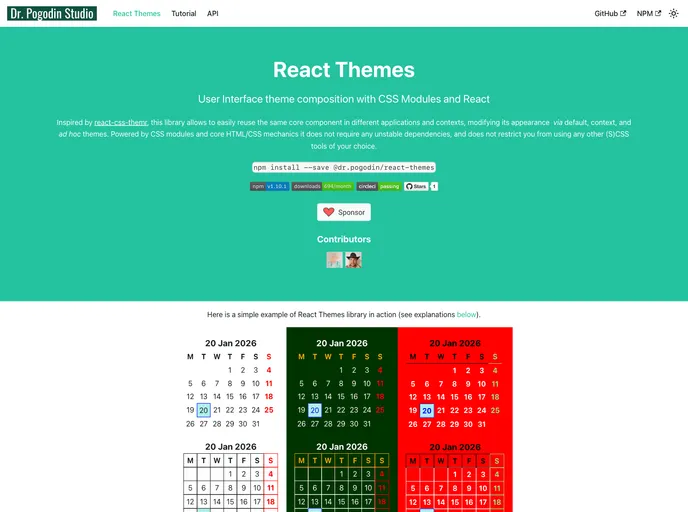 React Themes is a library that provides themeable UI styling for React components. It allows developers to easily reuse core components across different applications and contexts, and modify their appearance using default, context, and ad hoc themes. Powered by CSS modules and core HTML/CSS mechanics, React Themes does not rely on unstable dependencies and does not restrict developers from using other (S)CSS tools of their choice.