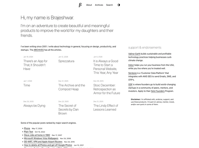 The personal website brajeshwar.com is a static site generated by Jekyll. It features a clean and organized design and includes a newsletter feature. The site was originally built using WordPress but was migrated to a static site in 2021. Overall, brajeshwar.com serves as a great example of a well-designed and functional personal website.