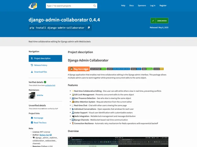 Django Admin Collaborator is an innovative tool designed to enhance the functionality of the Django admin interface, allowing multiple users to collaborate in real time. By leveraging WebSockets technology, this tool transforms the standard admin experience into a dynamic and interactive environment, making it easier for teams to work together on content and data management seamlessly.