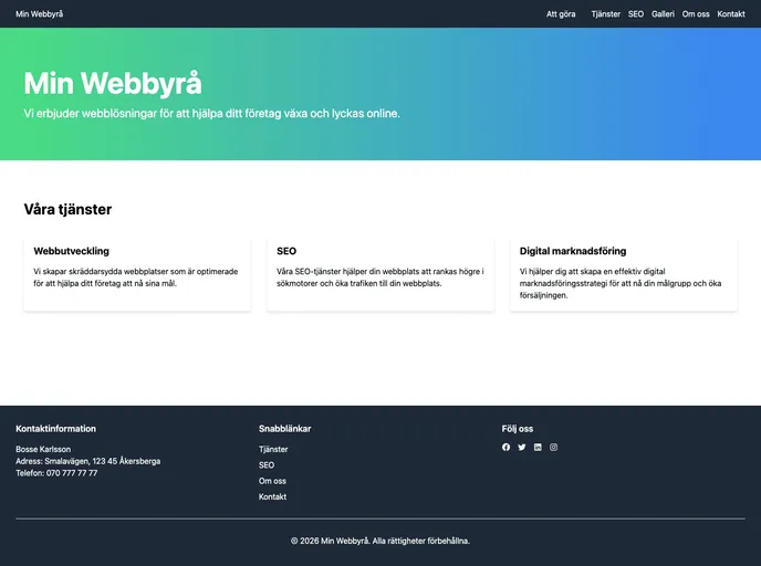 - Sökoptimering (SEO): Implementing basic SEO principles to make the website more search engine friendly, including metadata, headers, alt attributes for images, and structured data.