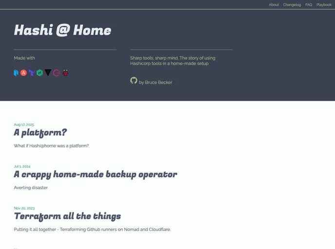 Hashi At Home is a Jekyll-based website that serves as a side project for the creator to indulge their Hashi itch. The website is deployed to Github Pages and utilizes Cloudflare for added performance and security. The website uses the Swiss Jekyll theme and allows for code highlighting with the Monokai color scheme.