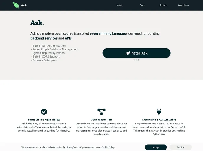 Ask is a modern open-source transpiled programming language, designed for building backend services and APIs. Ask reduces the amount of needed boilerplate code for setting up things like database connections and authentication to virtually zero lines.
