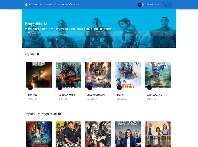 React ile moviedb apisi kullanarak film/dizi listelerini görüntüleme. MUI ile grafik düzenlemesi yapıldı.
