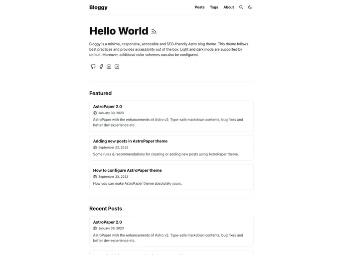 Bloggy is a fork of AstroPaper, a minimal, responsive, accessible, and SEO-friendly Astro blog theme. Bloggy introduces a modified design styled with Camome UI. It follows best practices and provides accessibility out of the box, supporting both light and dark modes. It also offers additional color schemes that can be easily configured. Bloggy is highly customizable and includes features such as type-safe markdown, super-fast performance, fuzzy search, draft posts, pagination, sitemap, RSS feed, and dynamic OG image generation for blog posts.