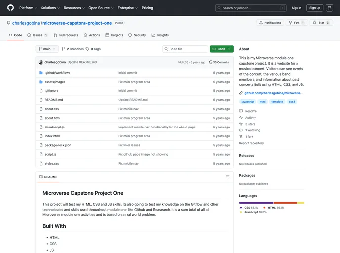 This is my Microverse module one capstone project. It is a website for a musical concert. Visitors can see events of the concert, the various band members, and information about past concerts Built using HTML, CSS, and JS.