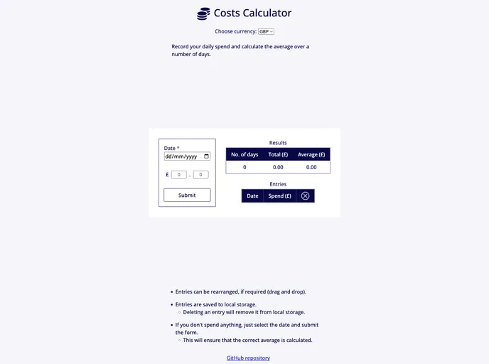 The Costs Calculator is a simple website that allows users to track their daily expenses and calculate the average spend over a period of time. It includes features such as adding a date, deleting entries, and dragging and dropping entries. The calculator also includes a currency selector and uses HTML, JavaScript, and CSS for its functionality and design.