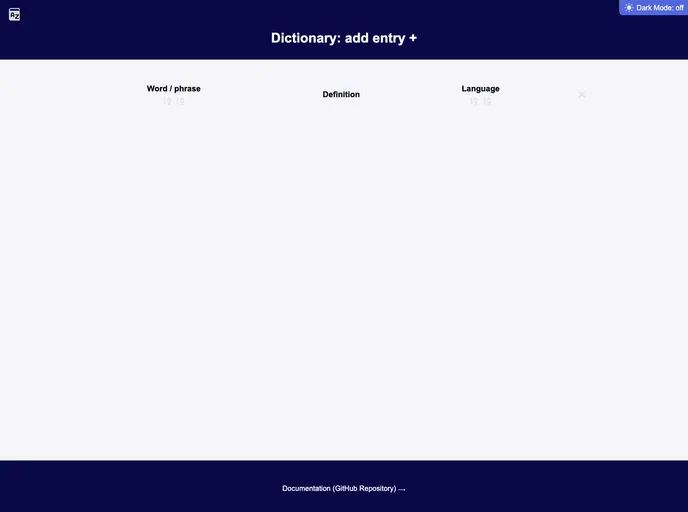 The Sortable Dictionary (V2) is a web application that allows users to look up and sort words in different languages. It features a modal dialog form for adding and editing entries, sorting functionality, responsive design, dark theme, and support for multiple languages. The application saves entries and other changes to local storage for persistence. It has been tested on Windows 10 using Chrome, Firefox, and Microsoft Edge browsers.