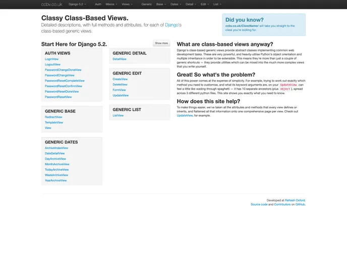 Ccbv is an innovative documentation tool tailored specifically for understanding Django's class-based views. It streamlines the learning process for developers by providing clear and concise explanations, making it easier to grasp the complexities of Django framework programming. Whether you’re a newbie trying to navigate class-based views or an experienced developer looking to refine your skills, Ccbv serves as a vital resource to enhance your understanding.